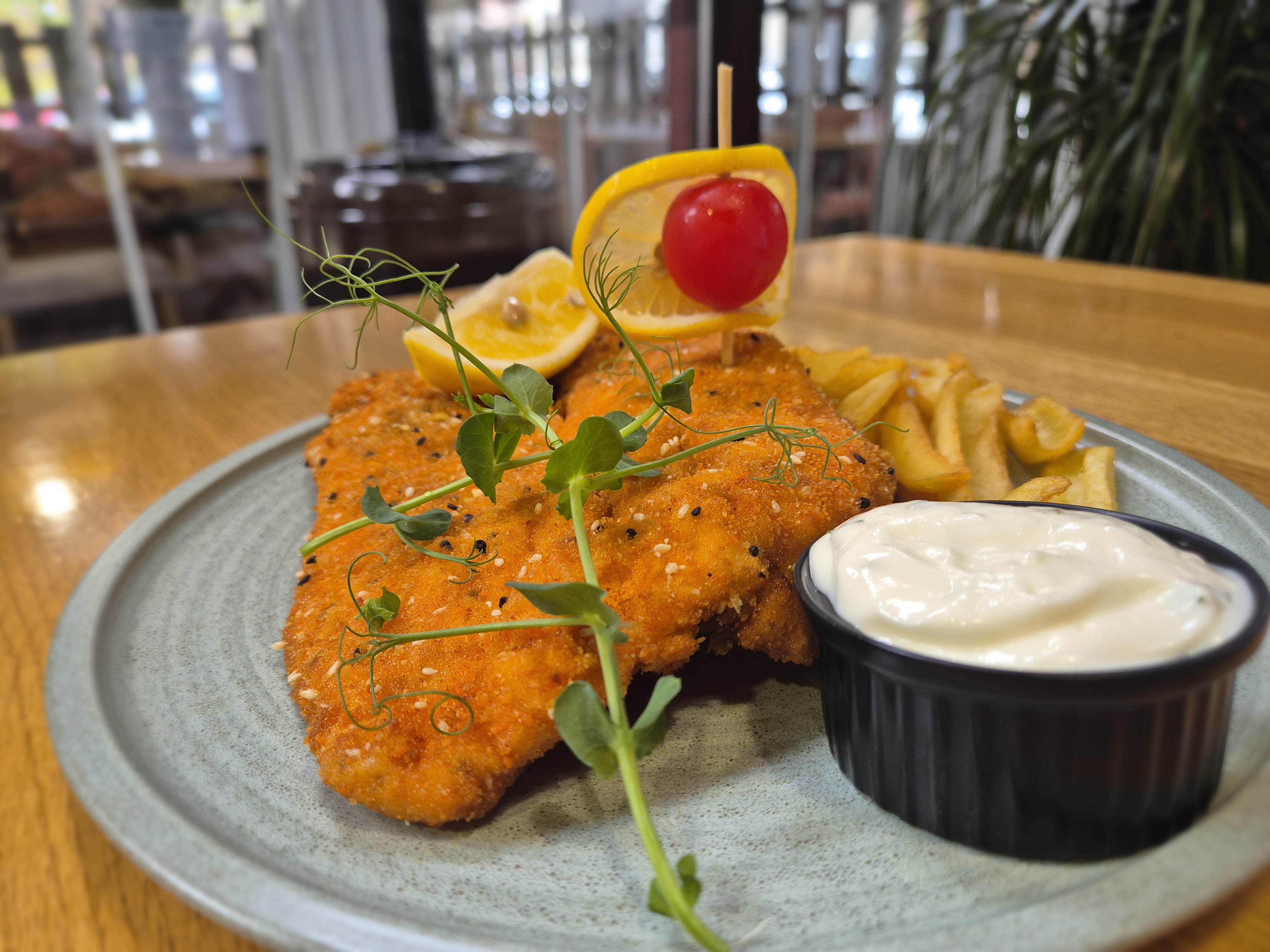 Шницел от пилешко филе с пържени картофи и чеснов сос 1.3.7 .11(400гр.) – 13.90лв. / 7.11€