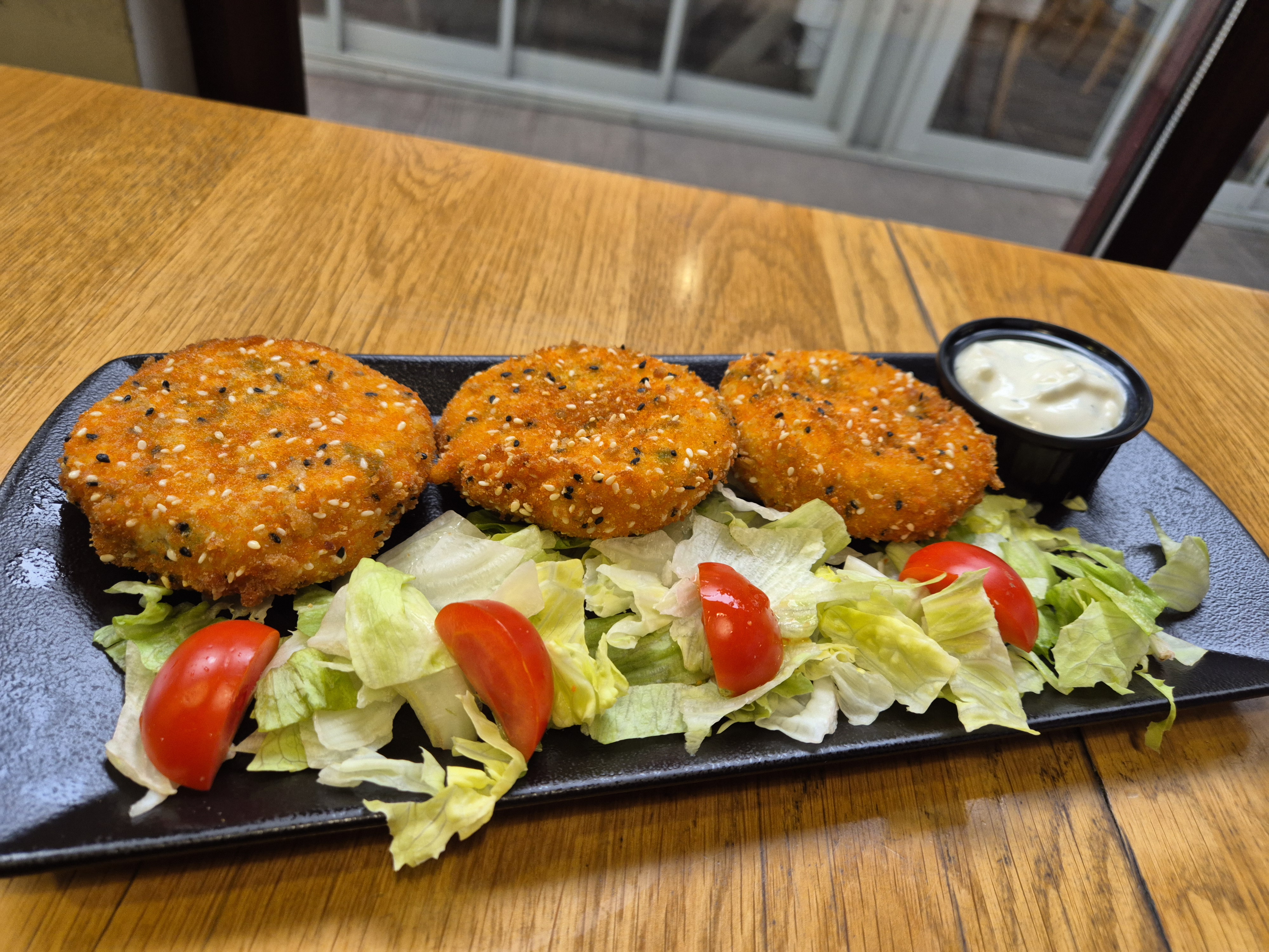 Хрупкави картофени кюфтета със сусам, чеснов сос и айсберг с чери домати (1.3.7.11) (400гр.) - 4.90 € / 9.60лв.