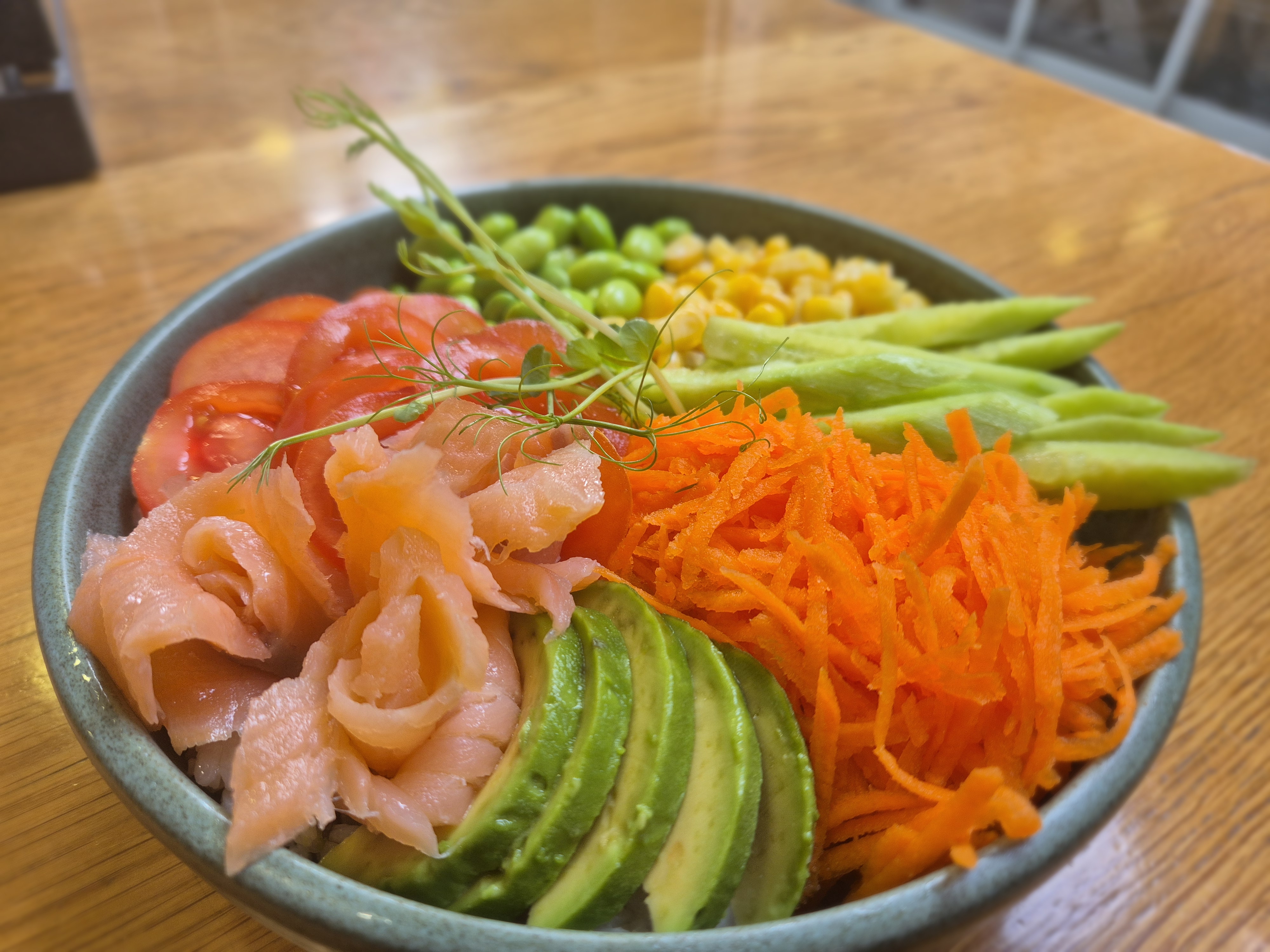 ( oриз или елда, пушена сьомга , авокадо, царевица, моркови, чери домат, едемаме, соев сос, цезар сос)